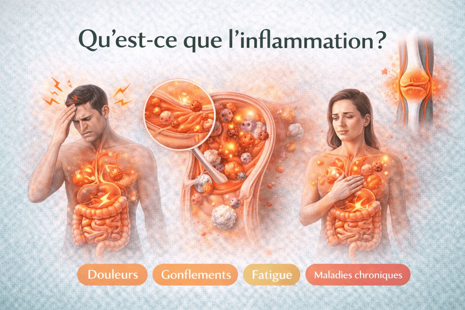 L'inflammation est la réponse naturelle de l'organisme à une blessure ou une infection. Elle se caractérise par des rougeurs, de la chaleur, un gonflement et de la douleur, et fait partie des mécanismes de protection et de cicatrisation des tissus mis en place par le système immunitaire. Si l'inflammation aiguë est une réaction de courte durée, l'inflammation chronique peut persister et est associée à divers problèmes de santé.